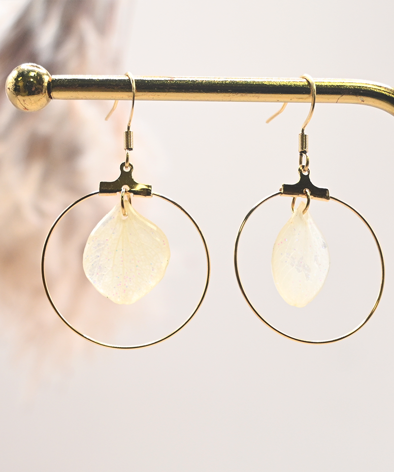 Laissez-vous séduire par ces créoles délicates qui mettent en valeur un véritable pétale d’hortensia. Chaque pétale est soigneusement sélectionné, puis protégé dans une fine couche de résine transparente qui fige sa beauté naturelle tout en dévoilant ses nervures uniques.