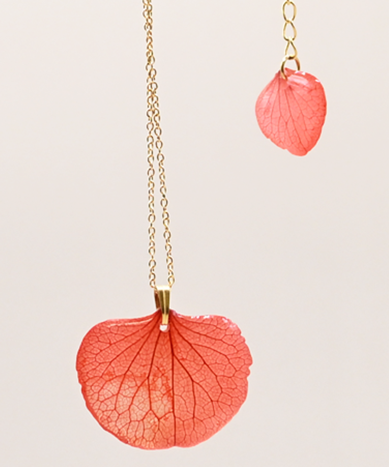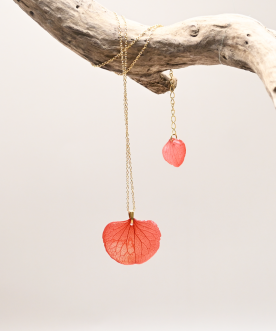 Succombez à la délicatesse de ce collier unique, où de véritables pétales d’hortensia sont sublimés par une chaîne fine et élégante. Le pendentif principal met en valeur un pétale soigneusement enveloppé dans une résine transparente, qui protège sa fragilité tout en laissant apparaître ses nervures naturelles.