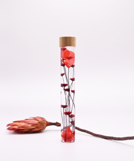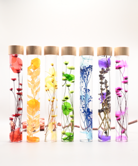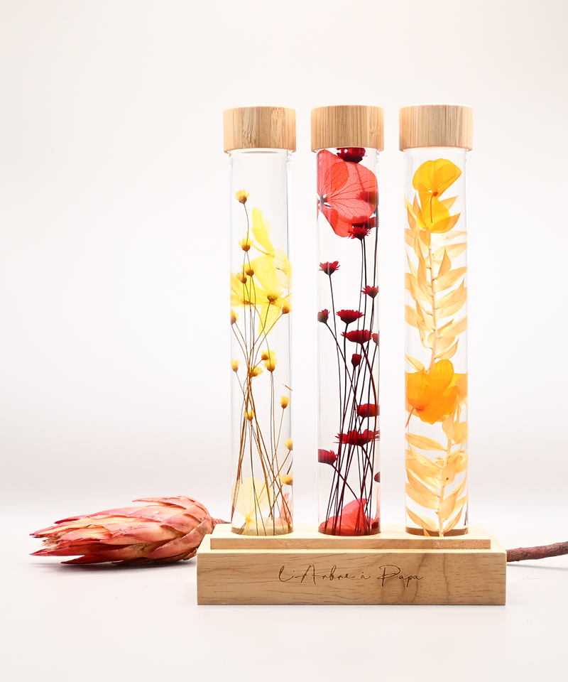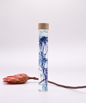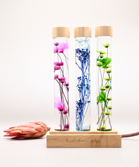 Chaque fiole renferme des fleurs séchées éclatantes, préservées dans un liquide de conservation qui sublime leurs couleurs et leur beauté au fil du temps.