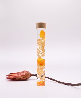 Chaque création renferme des fleurs séchées éclatantes, préservées dans un liquide de conservation qui maintient leur beauté et leurs couleurs au fil du temps.