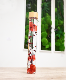 Chaque fiole renferme des fleurs séchées éclatantes, préservées dans un liquide de conservation qui sublime leurs couleurs et leur beauté au fil du temps.