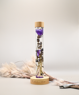 Chaque fiole renferme des fleurs séchées éclatantes, préservées dans un liquide de conservation qui sublime leurs couleurs et leur beauté au fil du temps.